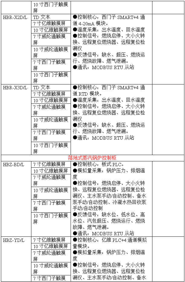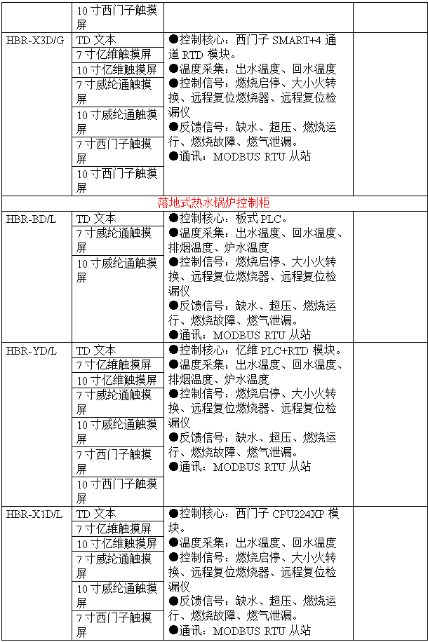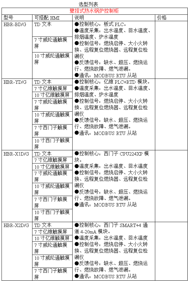 HBR-BD/G型壁掛式熱水鍋爐控制柜,采用板式PLC,可帶4路PT100溫度信號,并帶MODBUS RTU接口。